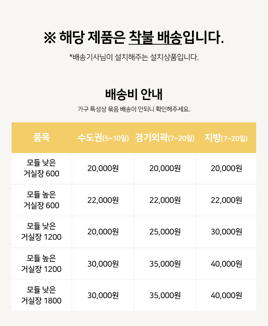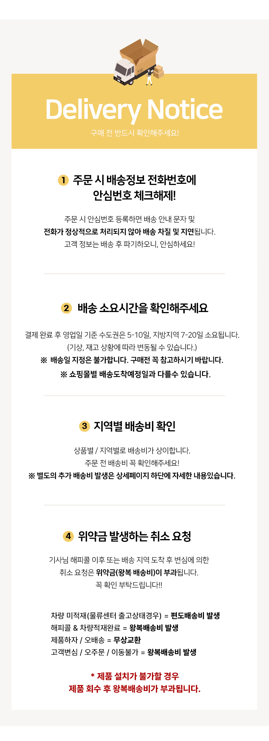 - 배송안내: 결제 완료 후 영업일 기준 수도권 5-10일 / 지방지역 7-20일 소요됩니다.