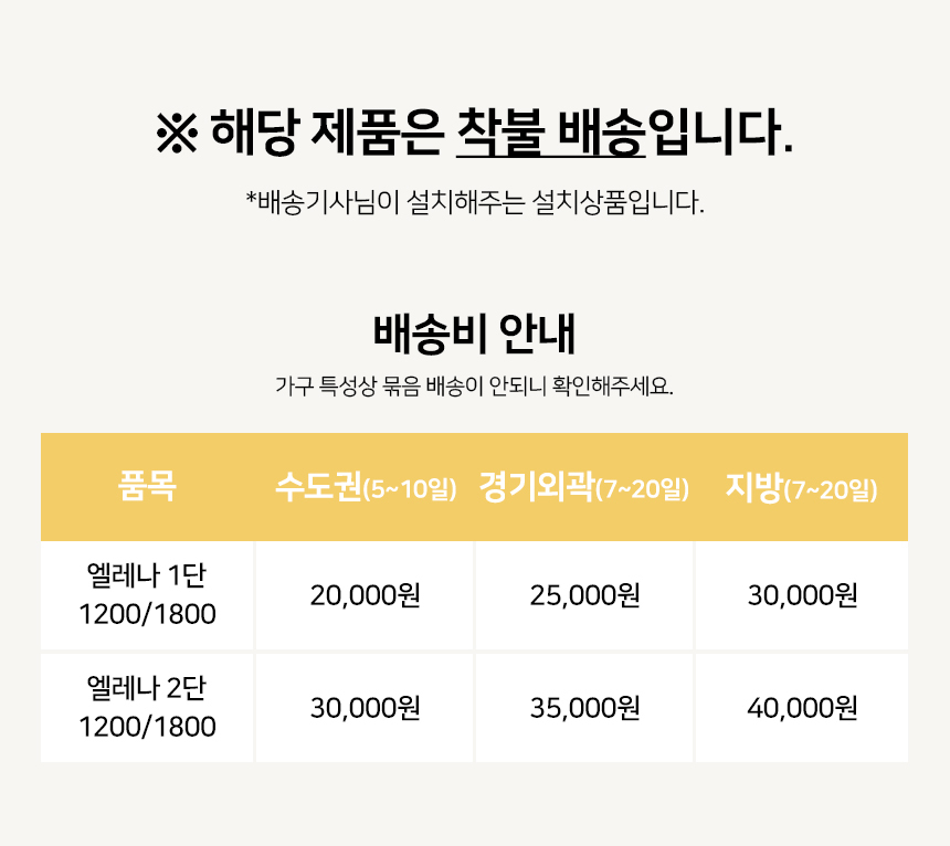 - 배송안내: 결제 완료 후 영업일 기준 수도권 5-10일 / 지방지역 7-20일 소요됩니다.