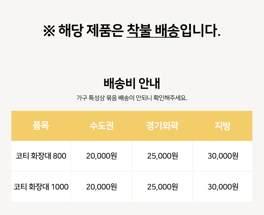 | 배송,설치비용 | -착불배송(상세페이지 하단 배송정보참조) -제주,도서산간 배송불가 -지역별 배송비 차이 있을 수 있습니다. |